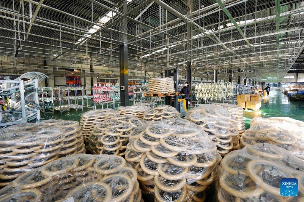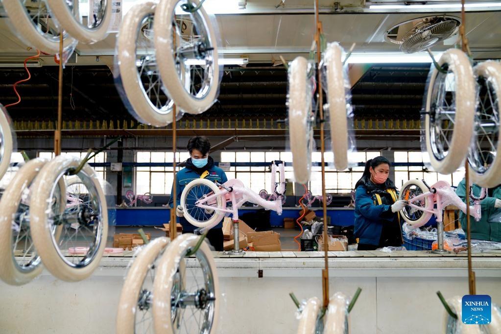Workers are seen busy on the production line at a factory of a bicycle and baby stroller manufacturer in Pingxiang County, north China's Hebei Province, Dec. 27, 2022. (Xinhua/Mu Yu)