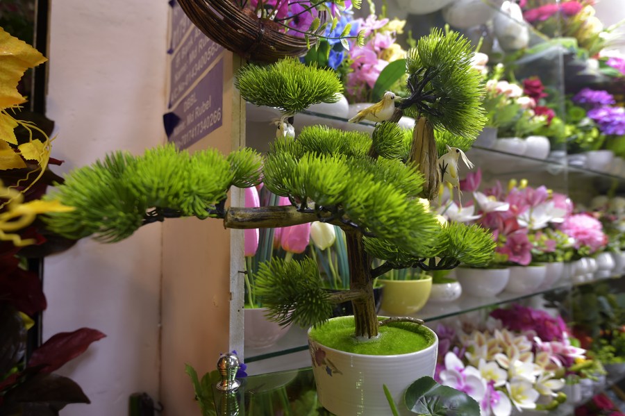 People visit a flower shop selling artificial polyester flowers imported from China in Dhaka, Bangladesh, Dec. 11, 2022. (Xinhua)