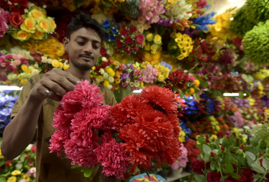 A vendor arranges artificial flowers imported from China at a shop in Dhaka, Bangladesh, Dec. 11, 2022. (Xinhua)