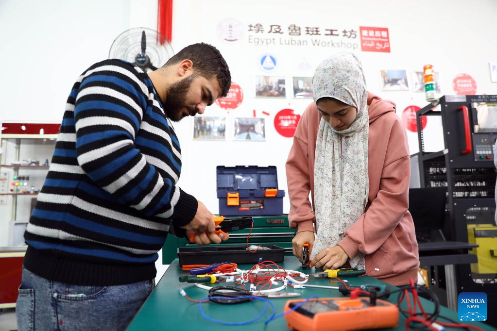Trainees learn circuit connection at the computer numerical control (CNC) installation training area of Luban Workshop at Ain Shams University in Cairo, Egypt, on Dec. 21, 2022. (Xinhua/Ahmed Gomaa)