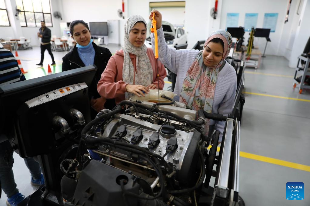 People receive training at the automobile application and maintenance technology training area of Luban Workshop at Ain Shams University in Cairo, Egypt, on Dec. 21, 2022. (Xinhua/Ahmed Gomaa)