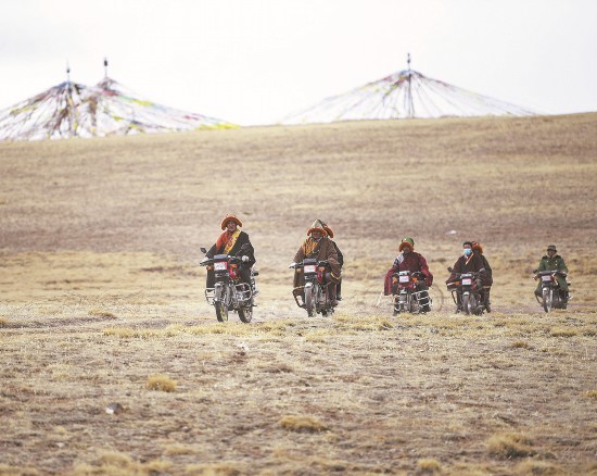 Environmental protection workers patrol on motorbikes in Qumarleb county, Qinghai province, on April 21. ZHANG LONG/XINHUA