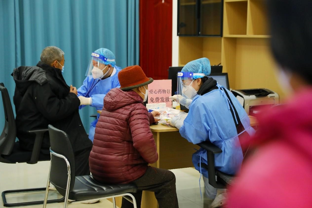 Doctors offer free services to residents and give free medicine to them in a community health center in Qingdao, east China's Shandong province, Dec. 21, 2022. (People's Daily Online/Zhang Ying)
