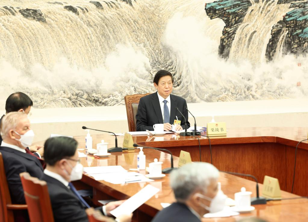 Li Zhanshu, chairman of the National People's Congress (NPC) Standing Committee, presides over the 131st meeting of the Council of Chairpersons of the 13th NPC Standing Committee at the Great Hall of the People in Beijing, capital of China, Dec. 29, 2022. (Xinhua/Pang Xinglei)