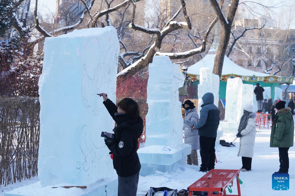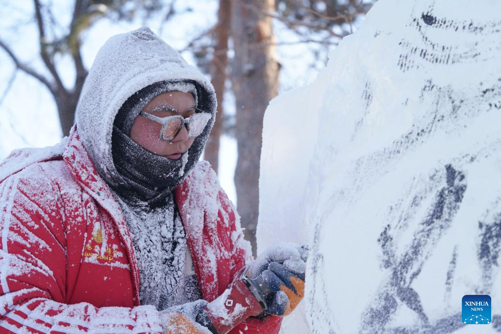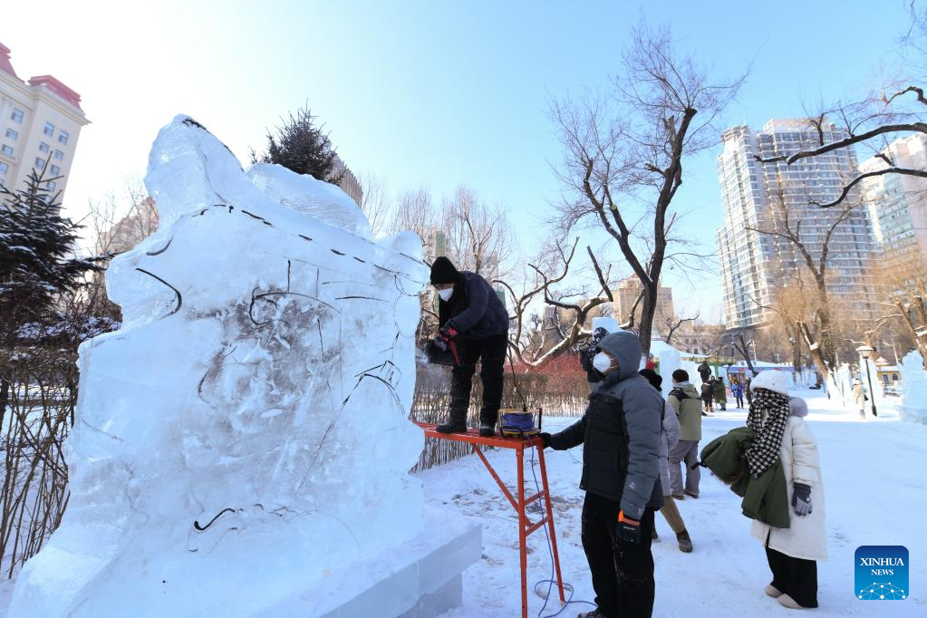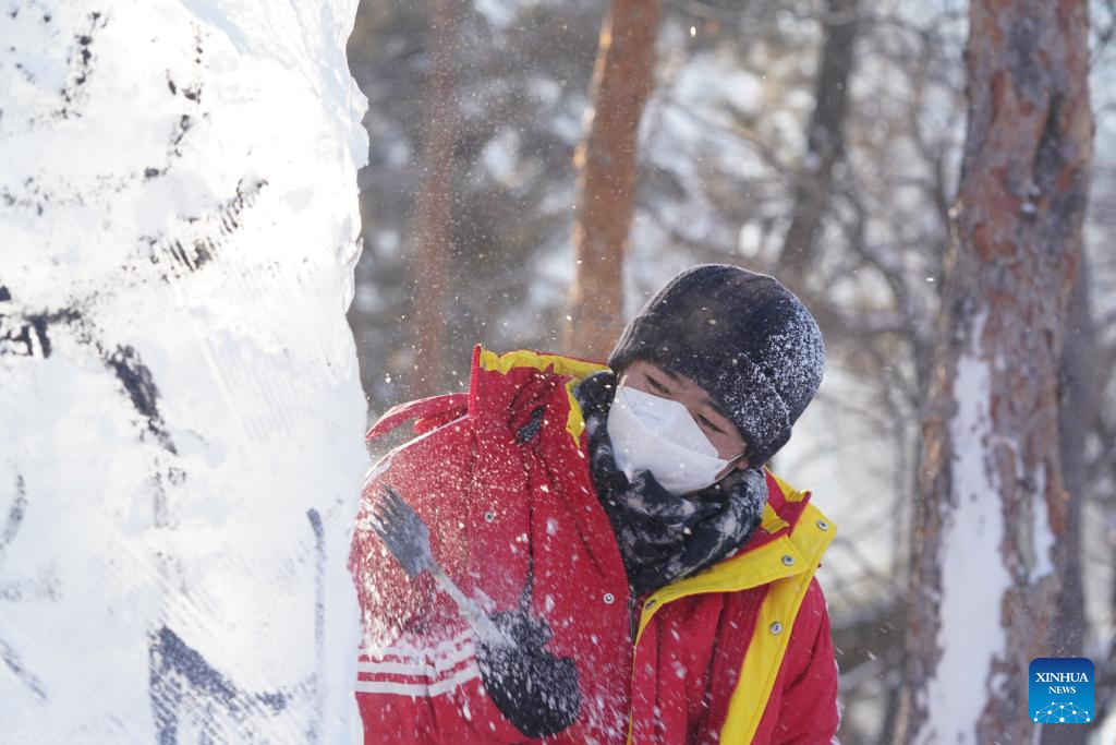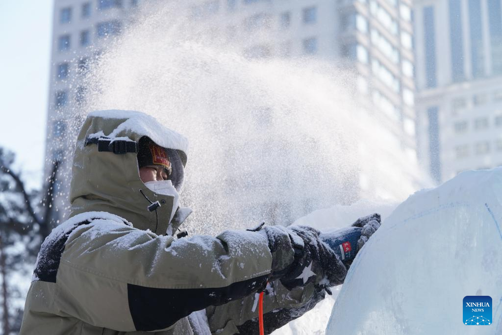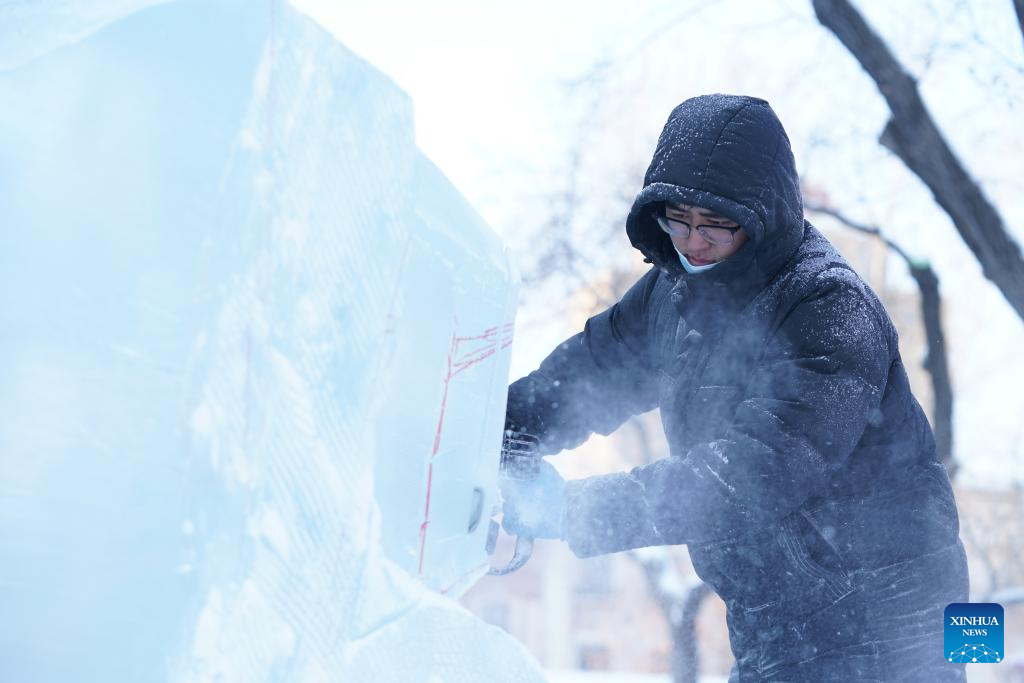 A contestant works on an ice sculpture during a competition in Zhaolin Park in Harbin, northeast China's Heilongjiang Province, Dec. 29, 2022. (Xinhua/Wang Song)