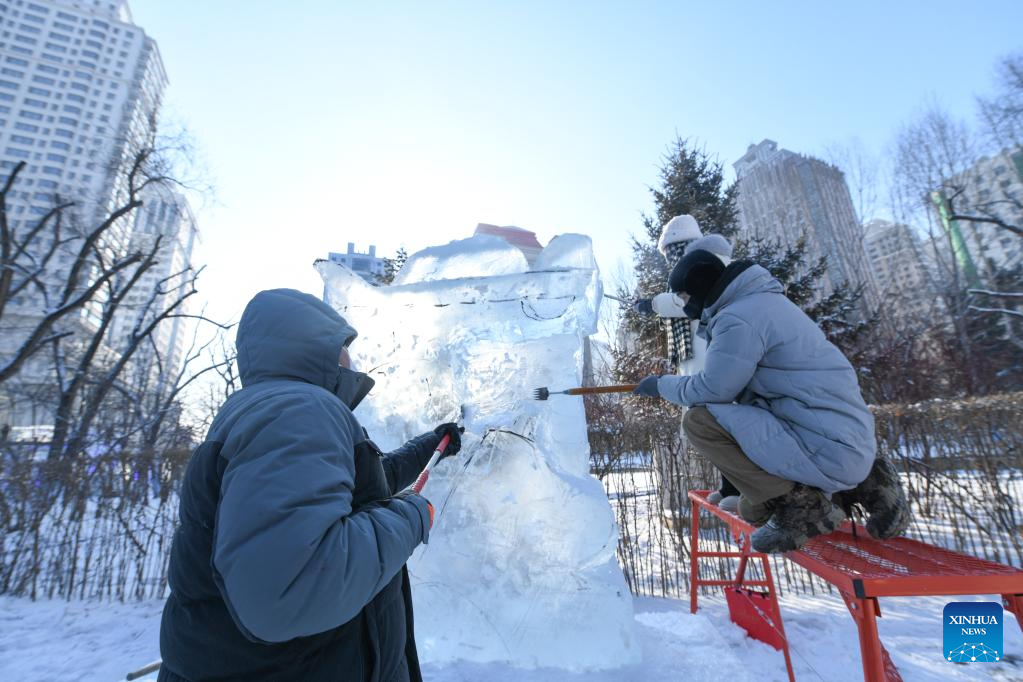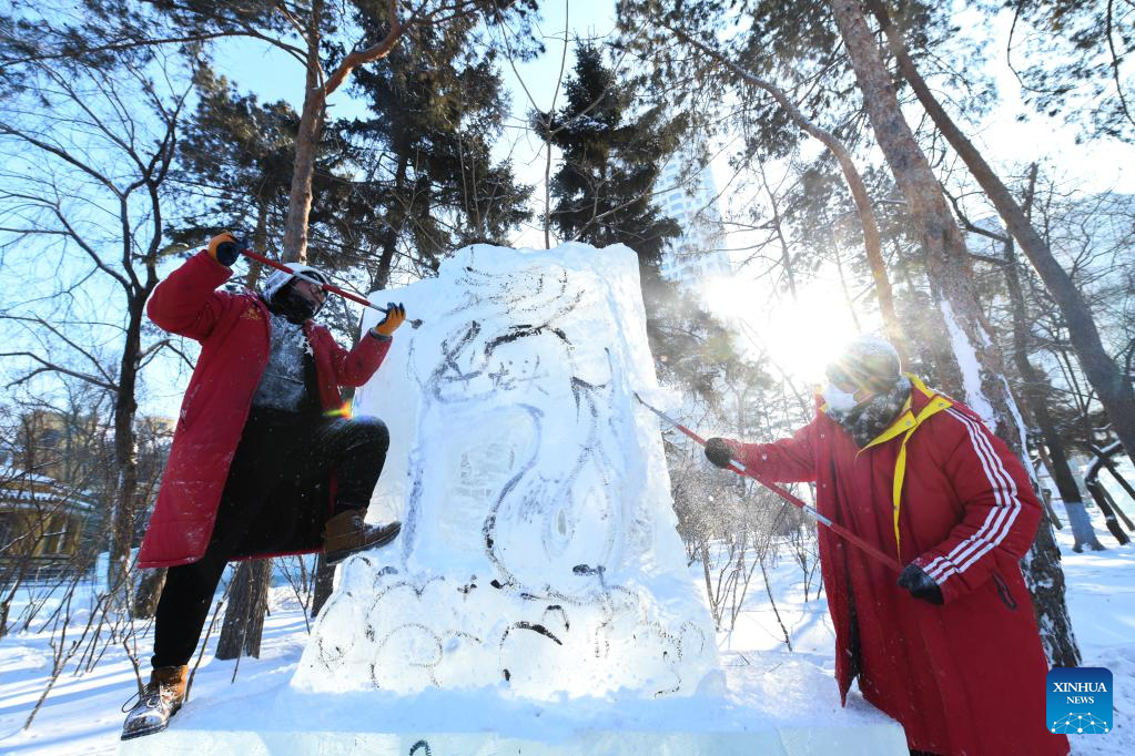 Contestants work on an ice sculpture during a competition in Zhaolin Park in Harbin, northeast China's Heilongjiang Province, Dec. 29, 2022. (Xinhua/Wang Song)