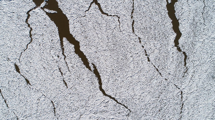 Aerial photo taken on Dec. 30, 2021 shows the frozen surface of the Yellow River in Shizuishan, northwest China's Ningxia Hui Autonomous Region. (Xinhua/Wang Peng)