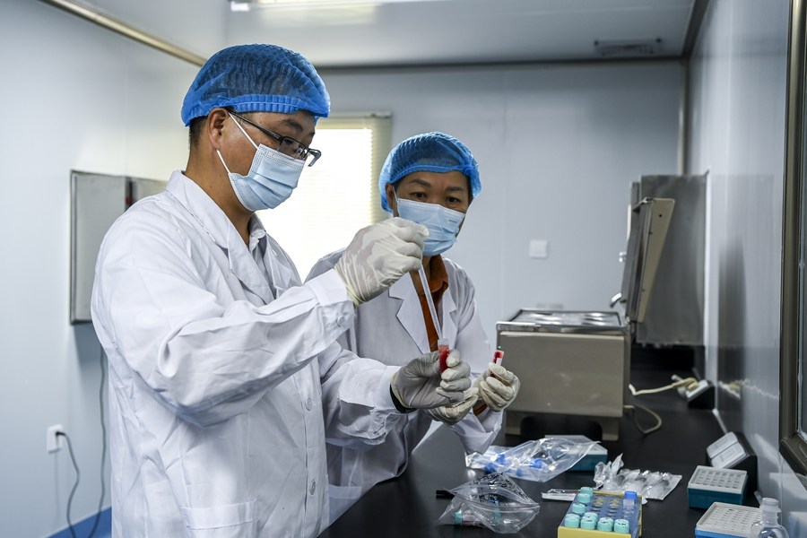 Technicians test poultry blood specimen at a laboratory in Xingye County, south China's Guangxi Zhuang Autonomous Region, Nov. 10, 2022. (Xinhua/Cao Yiming)