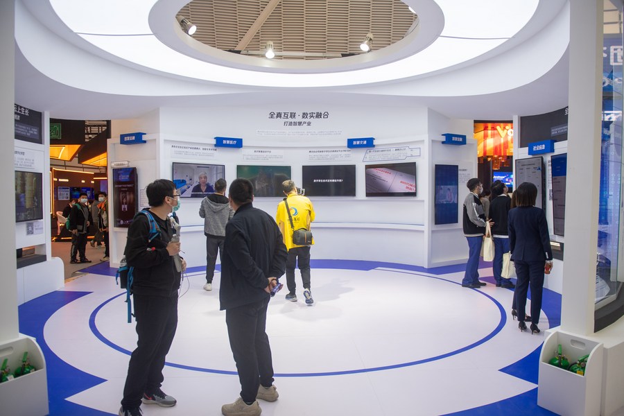 People visit the booth of Tencent during the Light of Internet Expo in Wuzhen, east China's Zhejiang Province, Nov. 8, 2022. (Xinhua/Jiang Han)