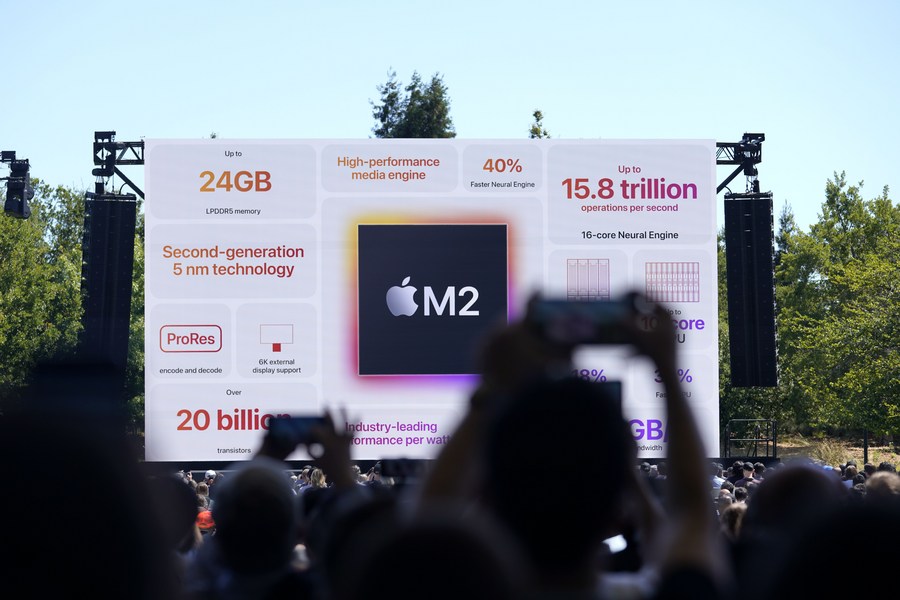 People attend a keynote address event during the 2022 Apple Worldwide Developers Conference (WWDC22) at the Apple Park in Cupertino, California, the United States, June 6, 2022. (Xinhua/Wu Xiaoling)