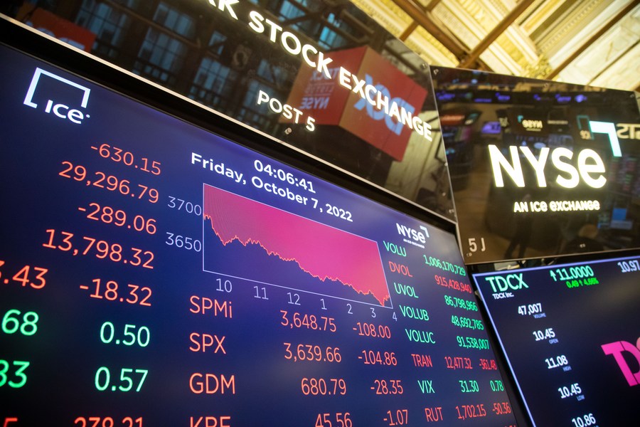 A monitor displays stock market information on the floor of the New York Stock Exchange (NYSE) in New York, the United States, Oct. 7, 2022. (Photo by Michael Nagle/Xinhua)
