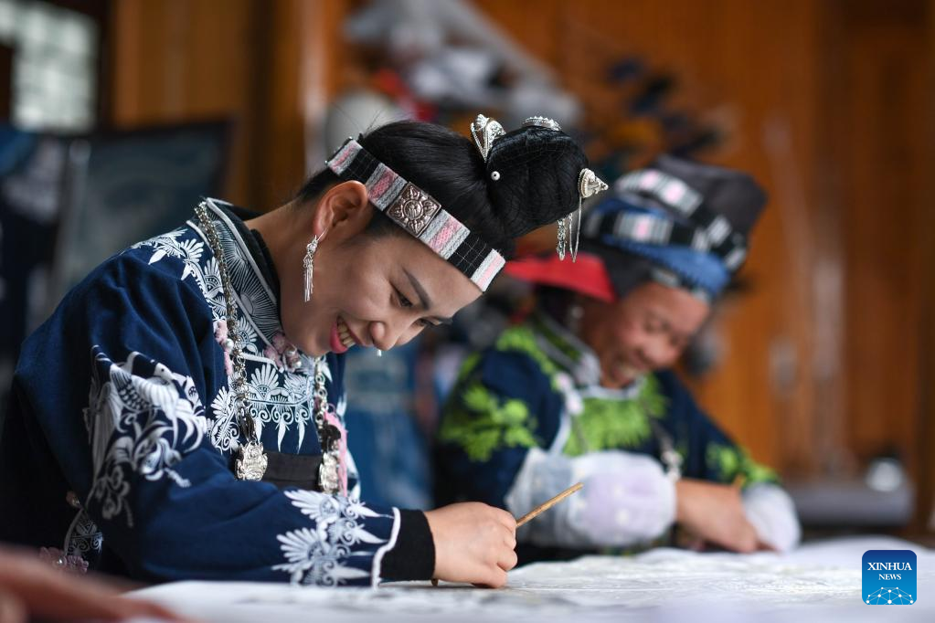 Villagers make batik paintings at a batik workshop in Kala Village in Longquan Township of Danzhai County, southwest China's Guizhou Province, Nov. 16, 2022. (Xinhua/Yang Wenbin)