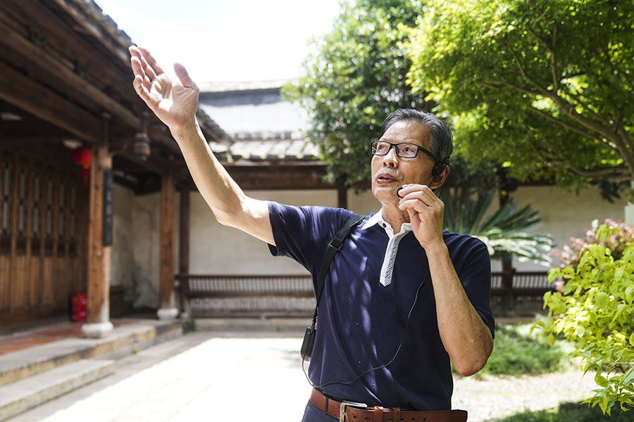 Photo shows Chen Yongjian, a volunteer guide at Sanfangqixiang (Three Lanes and Seven Alleys), an ancient city block in downtown Fuzhou, capital of southeast China's Fujian Province. (People's Daily Online/Peng Yukai)