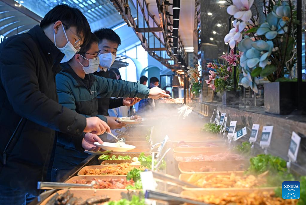 People enjoy buffet at a shopping mall in north China's Tianjin, Dec. 31, 2022, the first day of the New Year holiday. (Xinhua/Zhao Zishuo)