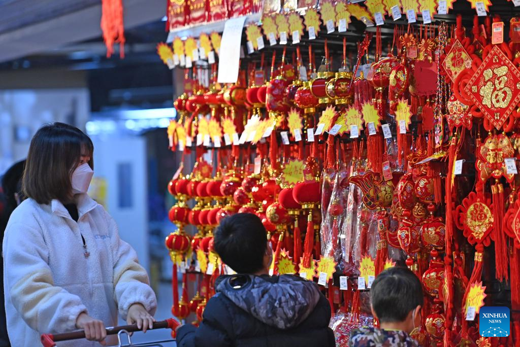 Customers select traditional decorations at a supermarket in north China's Tianjin, Dec. 31, 2022, the first day of the New Year holiday. (Xinhua/Zhao Zishuo)