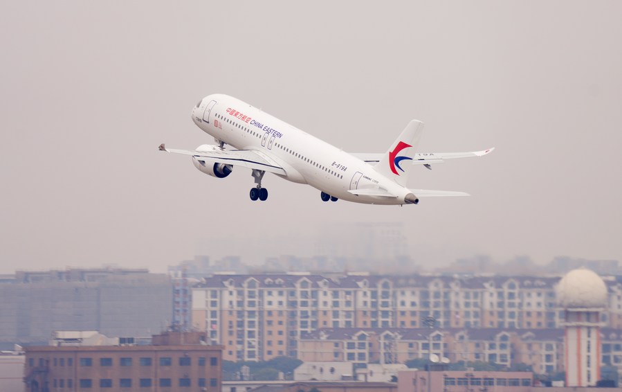 A C919 large passenger jetliner takes off at Shanghai Hongqiao International Airport in Shanghai, east China, Dec. 26, 2022. (Xinhua)