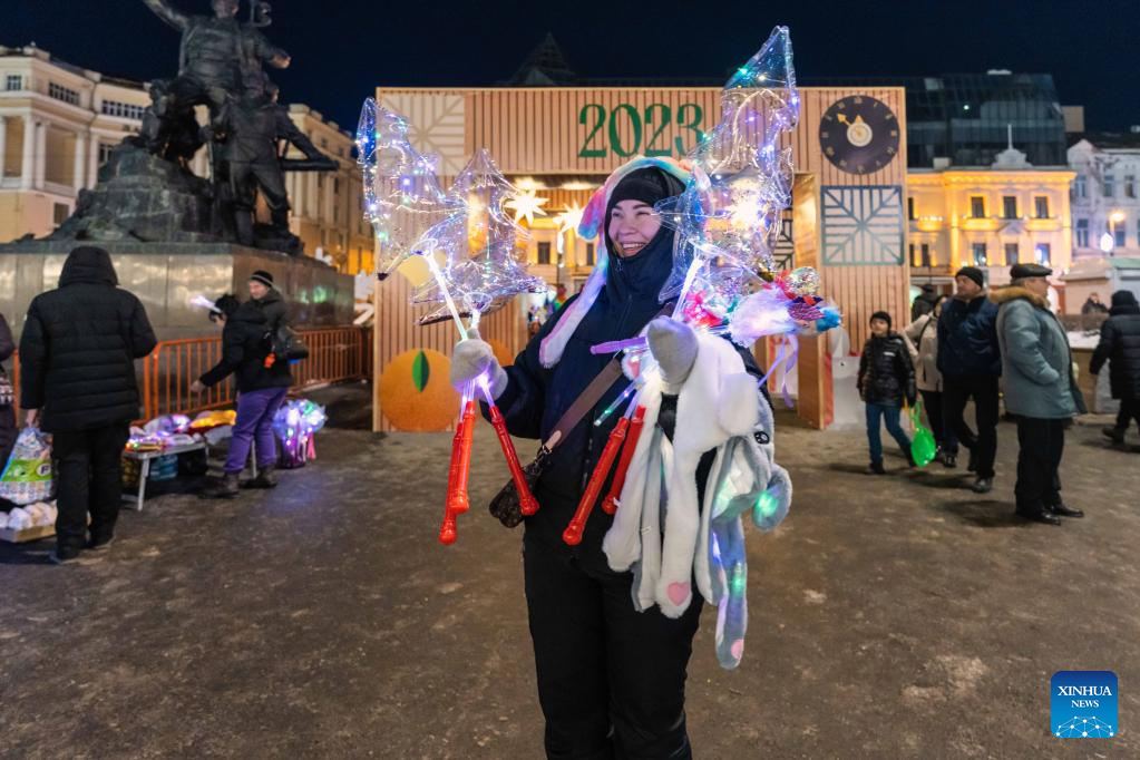 A seller sells toys and decorations in the central square of Vladivostok, Russia, Dec. 31, 2022. Entertainment facilities were installed in the central square of Vladivostok, a city in the Russia's Far East, to celebrate the upcoming new year. (Photo by Guo Feizhou/Xinhua)