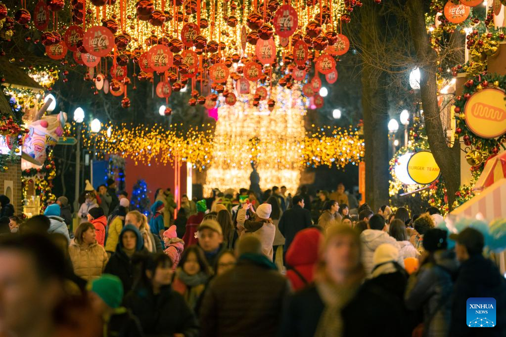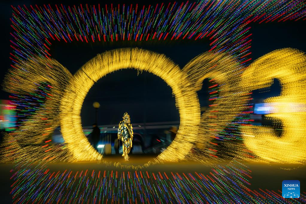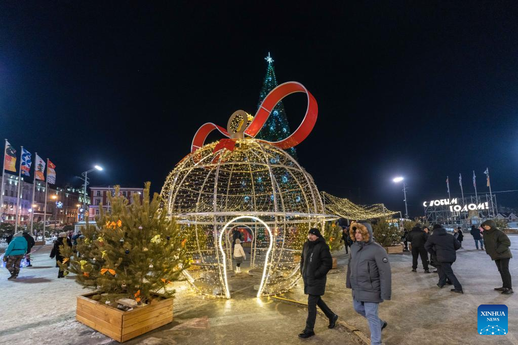 People walk past an illuminated installation in the central square of Vladivostok, Russia, Dec. 31, 2022. Entertainment facilities were installed in the central square of Vladivostok, a city in the Russia's Far East, to celebrate the upcoming new year. (Photo by Guo Feizhou/Xinhua)