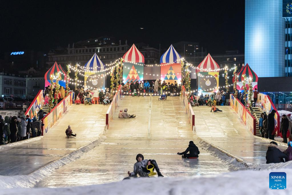 People play on ice slides in the central square of Vladivostok, Russia, Dec. 31, 2022. Entertainment facilities were installed in the central square of Vladivostok, a city in the Russia's Far East, to celebrate the upcoming new year. (Photo by Guo Feizhou/Xinhua)