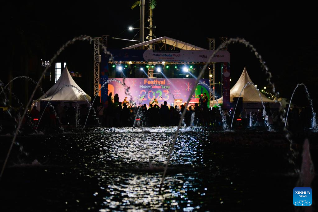 People enjoy a performance on a car-free street in Jakarta, capital of Indonesia, Dec. 31, 2022. A "car-free night" event allowing people to have fun on the car-free streets is held here on Saturday to welcome the New Year. (Xinhua/Xu Qin)