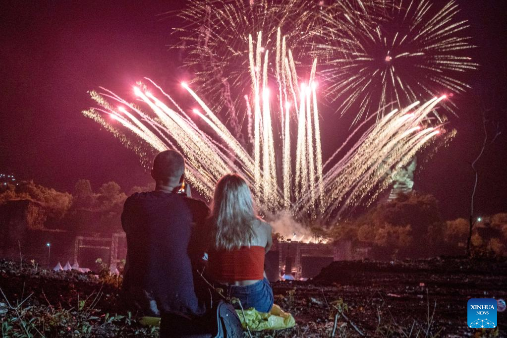 People watch fireworks during New Year's Eve celebration at Garuda Wisnu Kencana Cultural Park in Bali, Indonesia, Dec. 31, 2022. (Photo by Dicky Bisinglasi/Xinhua)