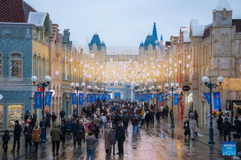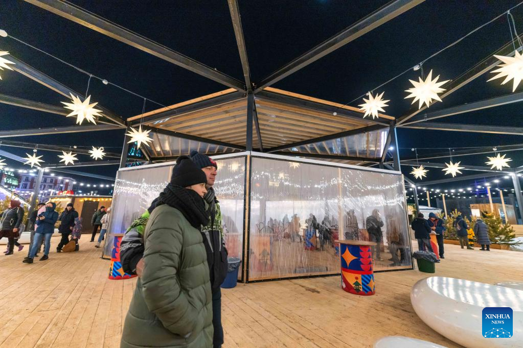 People walk past a food stand in the central square of Vladivostok, Russia, Dec. 31, 2022. Entertainment facilities were installed in the central square of Vladivostok, a city in the Russia's Far East, to celebrate the upcoming new year. (Photo by Guo Feizhou/Xinhua)