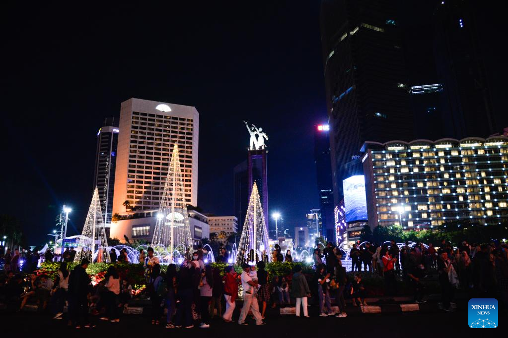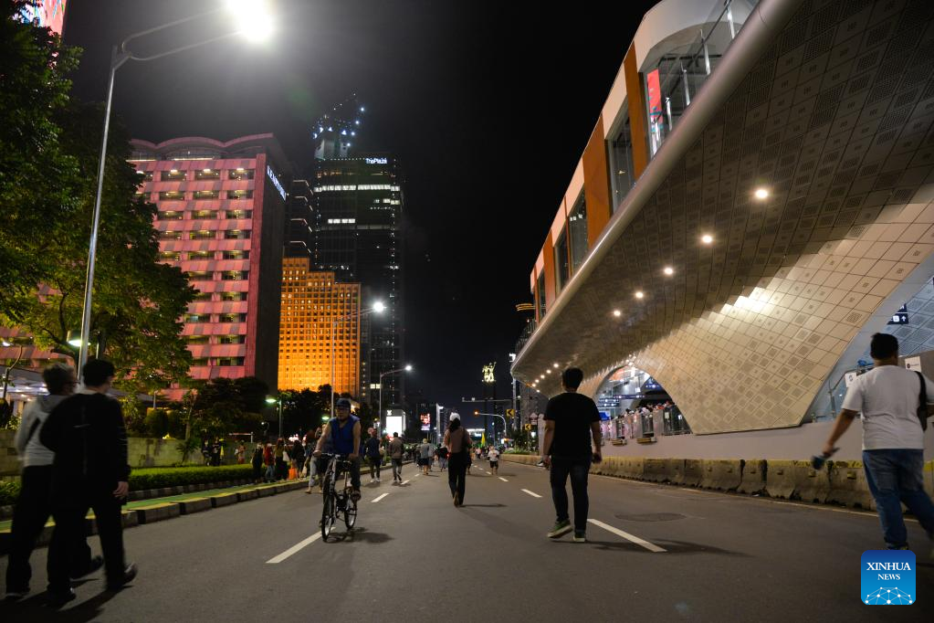 People walk on a car-free street in Jakarta, capital of Indonesia, Dec. 31, 2022. A "car-free night" event allowing people to have fun on the car-free streets is held here on Saturday to welcome the New Year. (Xinhua/Xu Qin)