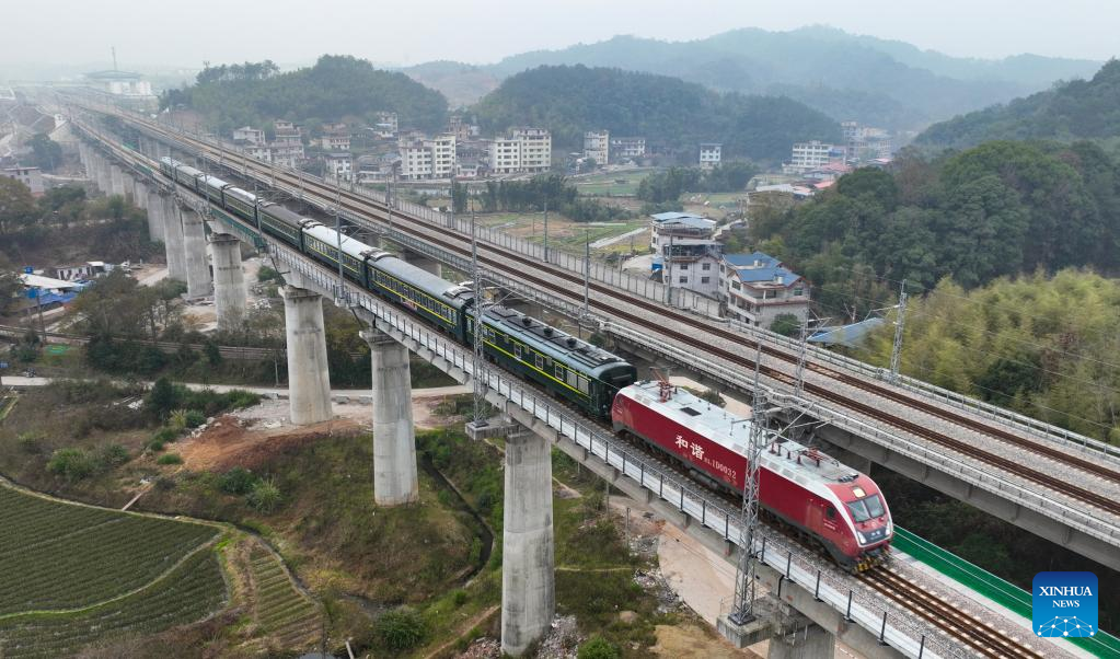 This aerial photo taken on Dec. 30, 2022 shows the train T8010 running along the Xingguo-Quanzhou railway. (Xinhua/Zhou Yi)