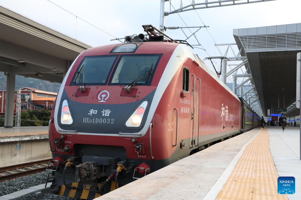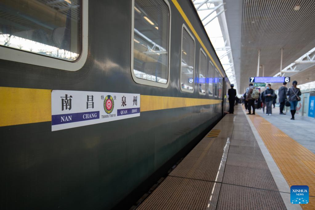 The train T8010 is seen at Quanzhou railway station in Quanzhou, southeast China's Fujian Province, Dec. 30, 2022. (Xinhua/Zhou Yi)