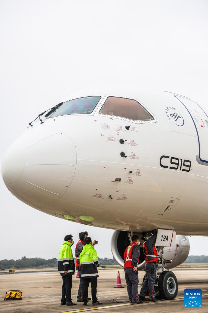 Technicians check a C919 large passenger aircraft, China's first homegrown large jetliner, at Meilan International Airport in Haikou, south China's Hainan Province, Jan. 2, 2023. (Xinhua/Zhang Liyun)