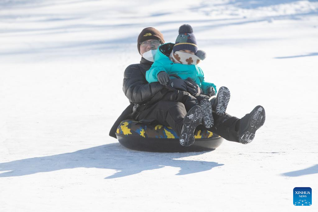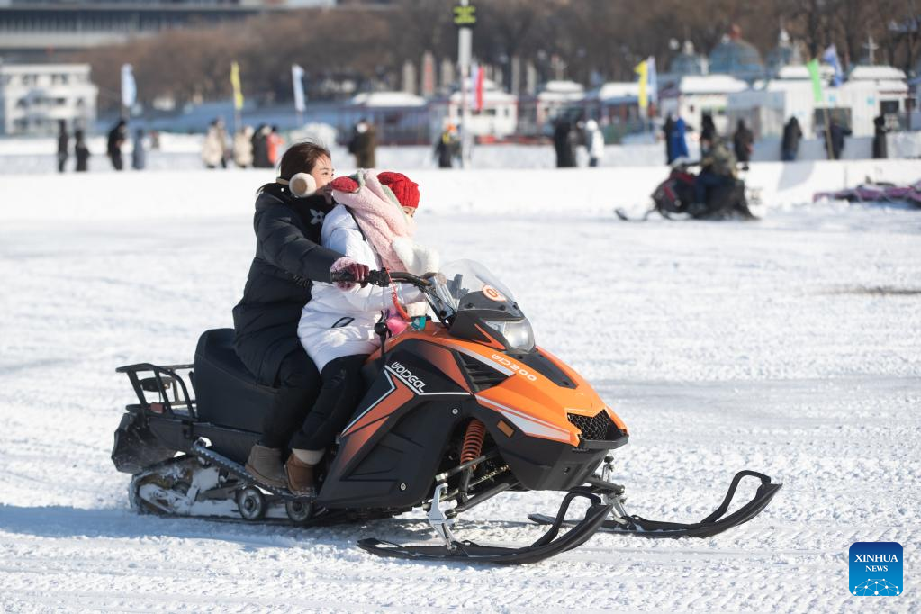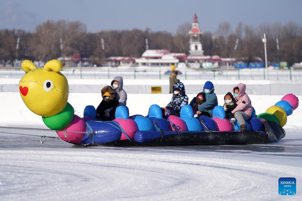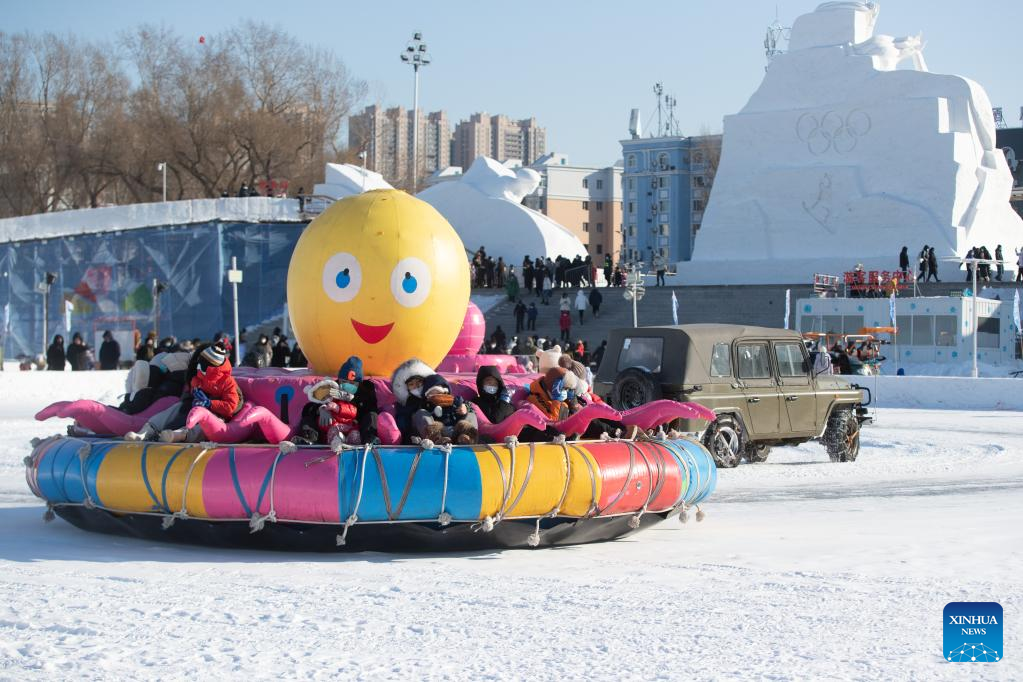 Tourists play at the Ice and Snow Carnival park on the Songhua River in Harbin, northeast China's Heilongjiang Province, Jan. 1, 2023. (Xinhua/Zhang Tao)