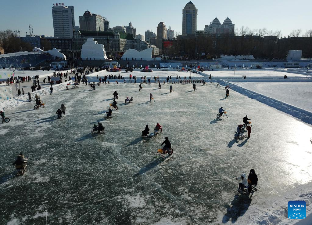 Tourists play at the Ice and Snow Carnival park on the Songhua River in Harbin, northeast China's Heilongjiang Province, Jan. 1, 2023. (Xinhua/Wang Jianwei)