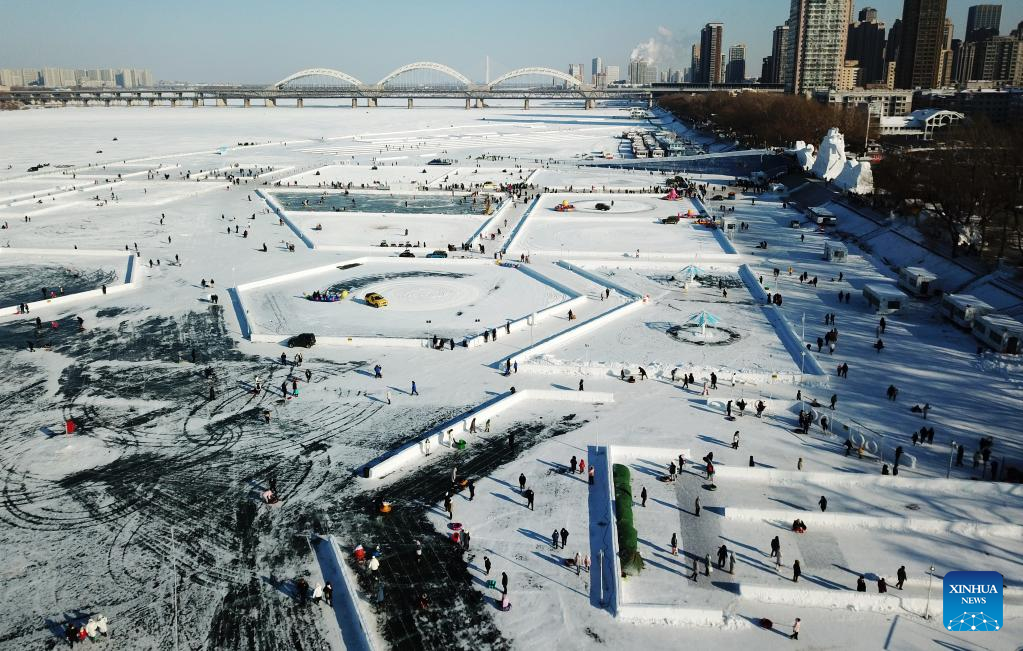 This aerial photo taken on Jan. 1, 2023 shows tourists playing at the Ice and Snow Carnival park on the Songhua River in Harbin, northeast China's Heilongjiang Province. (Xinhua/Wang Jianwei)