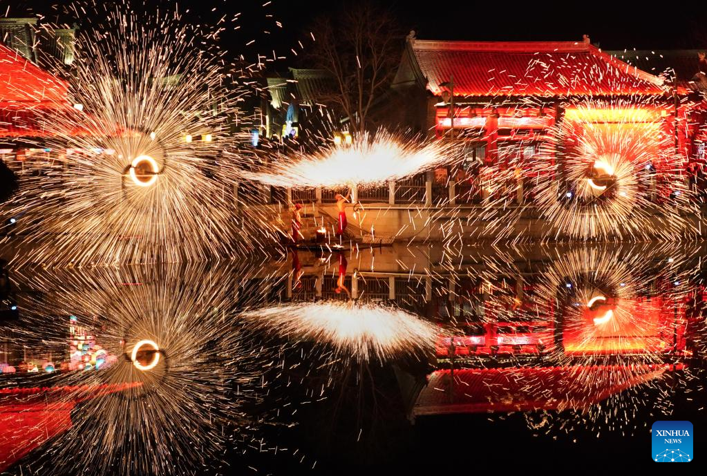 Staff members stage a molten iron fireworks performance at a movie-themed town in Zhongmu County of Zhengzhou, central China's Henan Province, Dec. 31, 2022. (Xinhua/Li An)