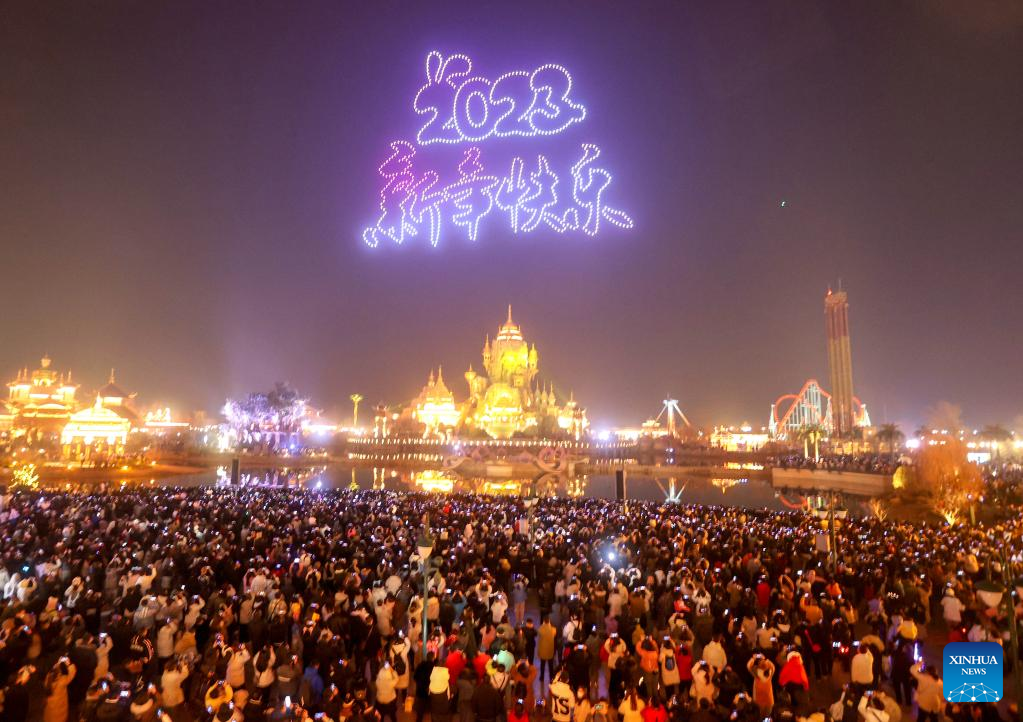 Tourists celebrate upcoming New Year at the Guangzhou Chimelong Tourist Resort in Guangzhou, south China's Guangdong Province, Dec. 31, 2022. People take part in various leisure activities to spend the New Year holiday here. (Xinhua/Liu Dawei)