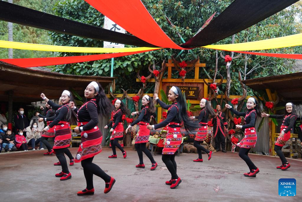 Actresses perform dance of Va ethnic group at a scenic spot in Kunming, southwest China's Yunnan Province, Dec. 31, 2022. (Photo by Liang Zhiqiang/Xinhua)