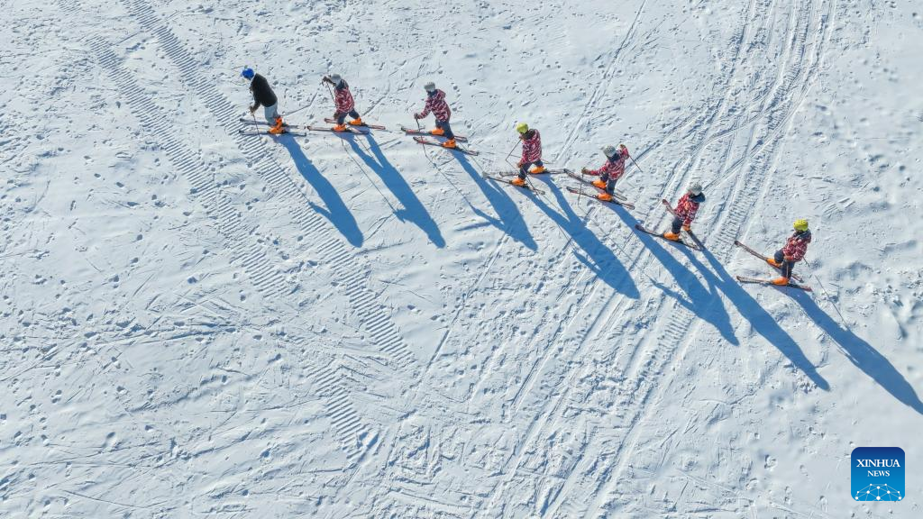 This aerial photo shows people skiing at a ski resort in Zunhua, north China's Hebei Province, Dec. 31, 2022. (Photo by Liu Mancang/Xinhua)