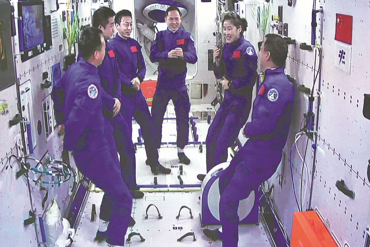 Six astronauts meet in the Tiangong Space Station on Nov 30. GUO ZHONGZHENG/XINHUA