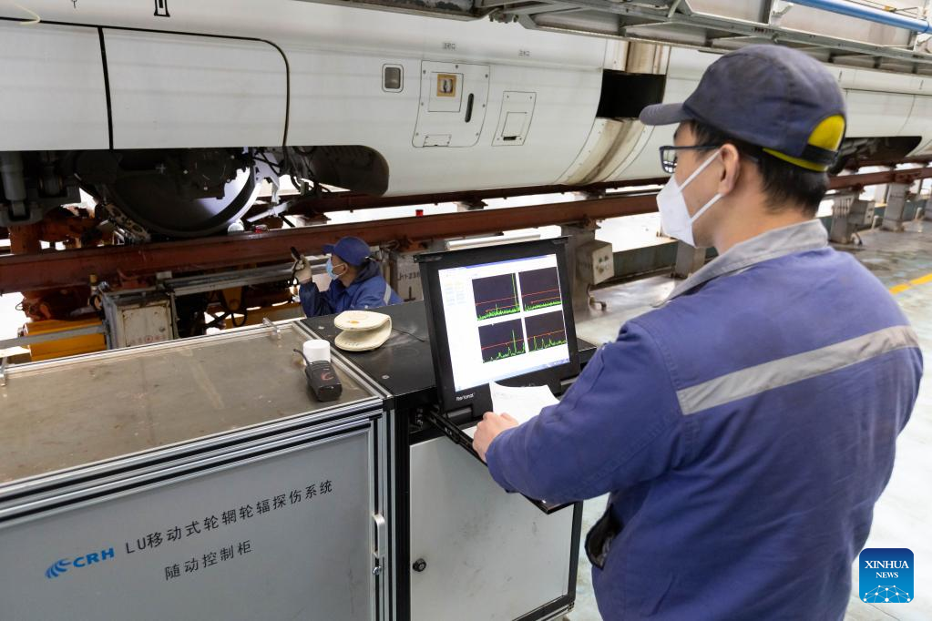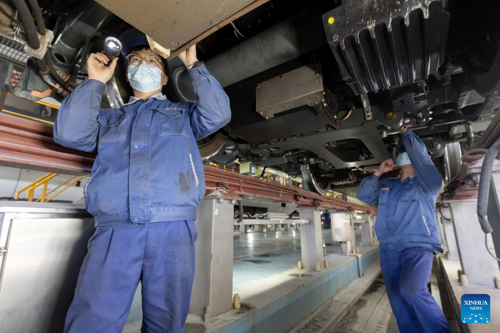 Railway workers of the Hongqiao high-speed train depot have stepped up their efforts on maintenance work for trains to prepare for the future travel rush during the Chinese Lunar New Year.
