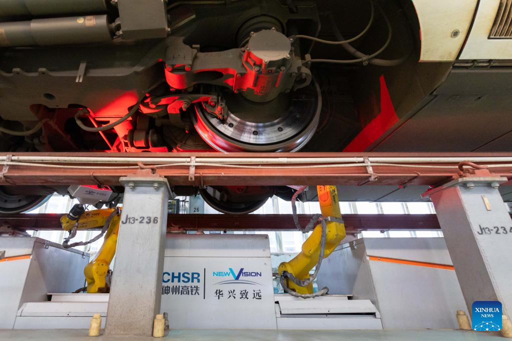 Robots carry out maintenance at the Hongqiao high-speed train depot in east China's Shanghai, Jan. 3, 2023. (Xinhua/Wang Xiang)