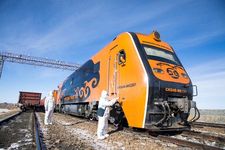 Staff members check the locomotive of a freight train in Erenhot, north China's Inner Mongolia Autonomous Region, Jan. 8, 2021. (Photo by Guo Pengjie/Xinhua)