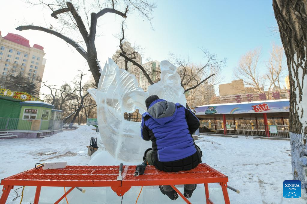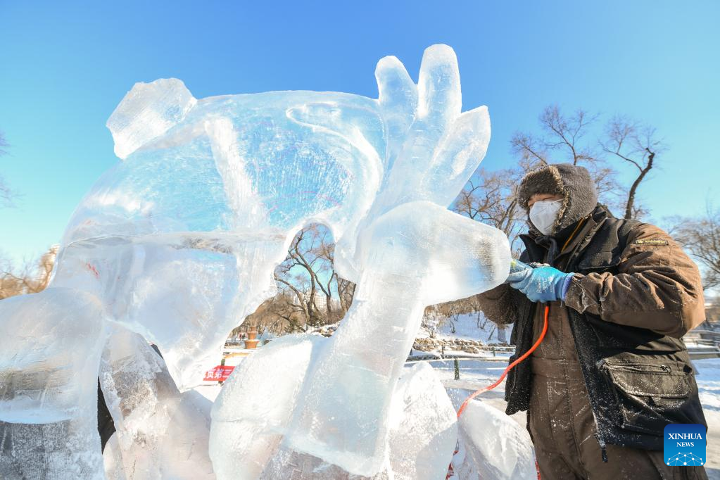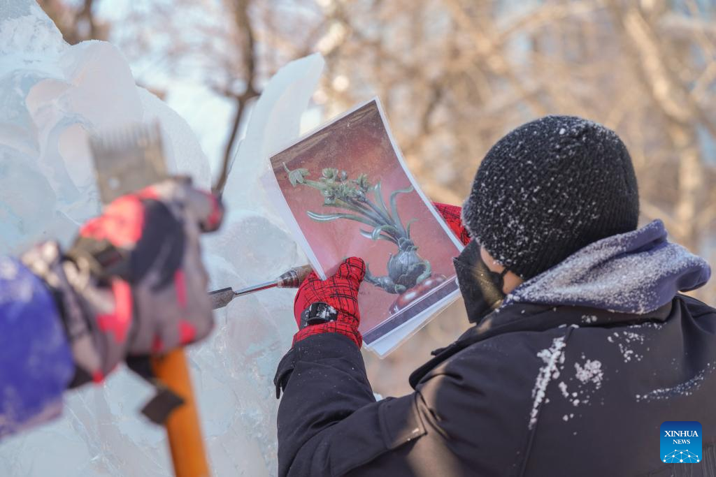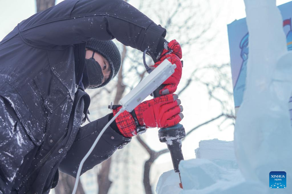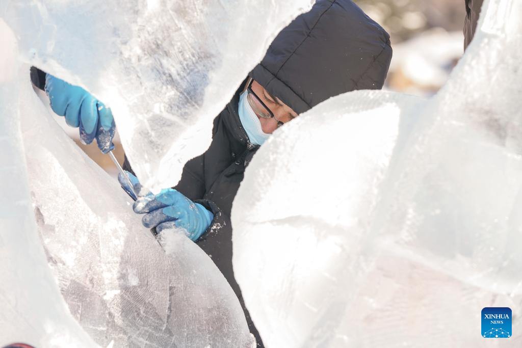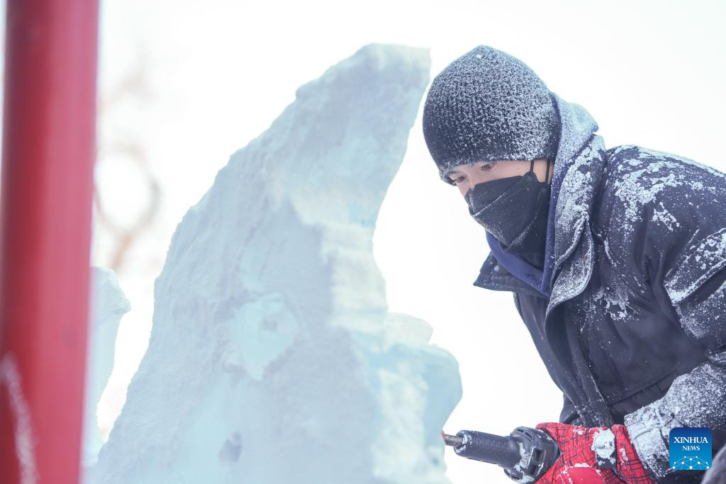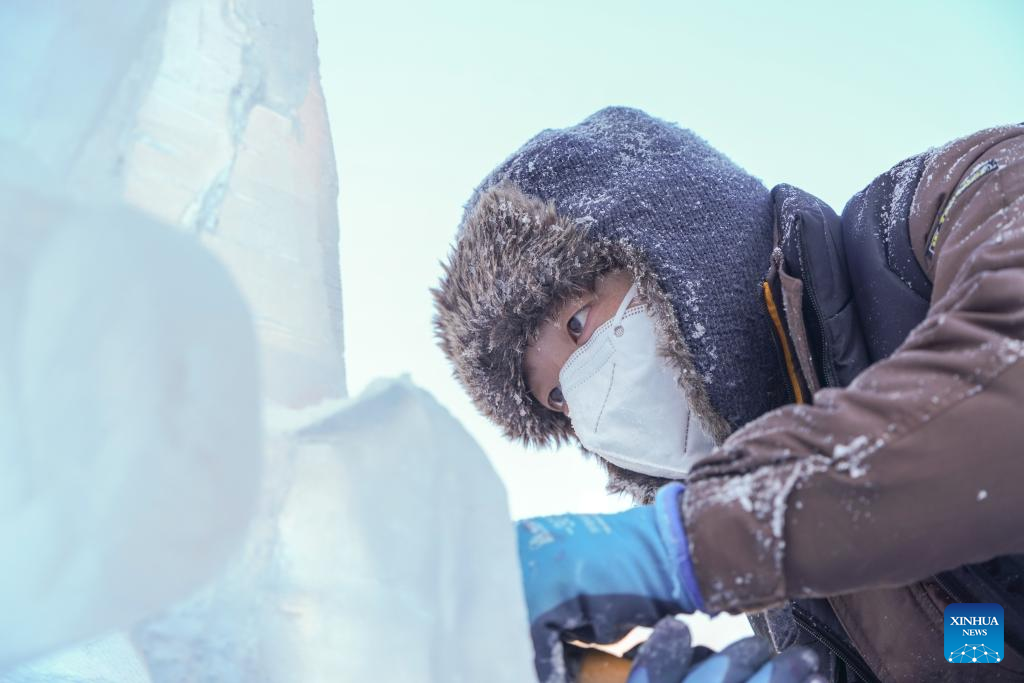 A contestant works on an ice sculpture during a competition at an ice lantern fair in Harbin, northeast China's Heilongjiang Province, Jan. 4, 2023. (Xinhua/Wang Song)