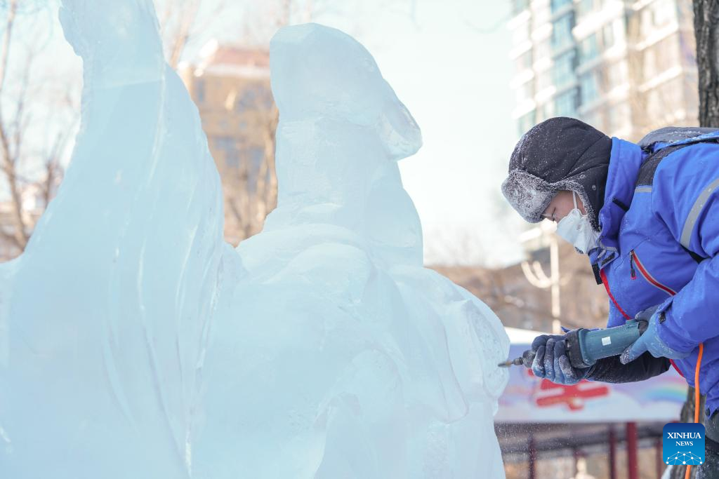 Contestants work on ice sculptures during a competition at an ice lantern fair in Harbin, northeast China's Heilongjiang Province, Jan. 4, 2023. (Xinhua/Wang Song)