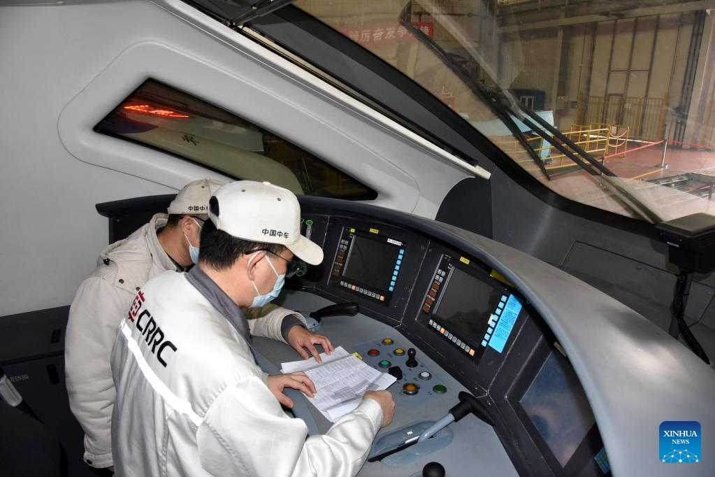 A technician debugs a train at a workshop of CRRC Qingdao Sifang Co., Ltd. in Qingdao, east China's Shandong Province, Jan. 4, 2023. (Xinhua/Li Ziheng)