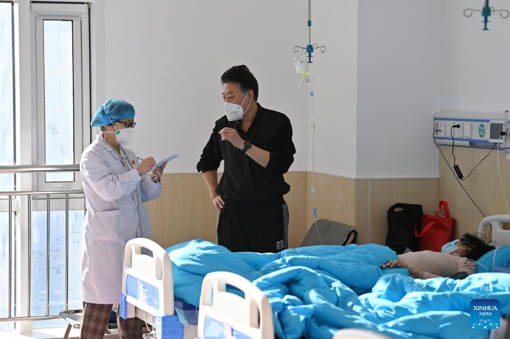 A medical worker questions about a patient's health conditions from her relative in a temporary fever clinic at Traditional Chinese Medicine Hospital of Xiqing District, north China's Tianjin, Dec. 28, 2022. (Xinhua/Li Ran)