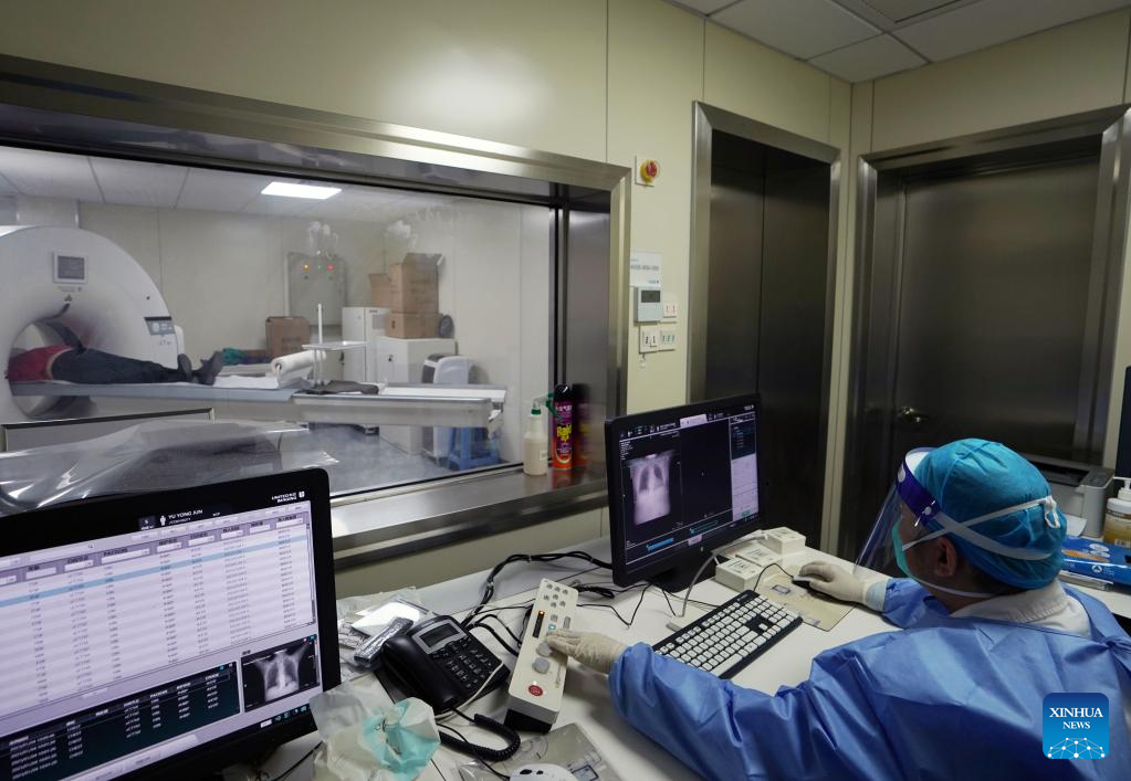 A medical worker conducts a computed tomography (CT) scan for a patient in the fever clinic of a community healthcare institution in Jiuting Town of Songjiang District, east China's Shanghai, Jan. 4, 2023. (Xinhua/Liu Ying)