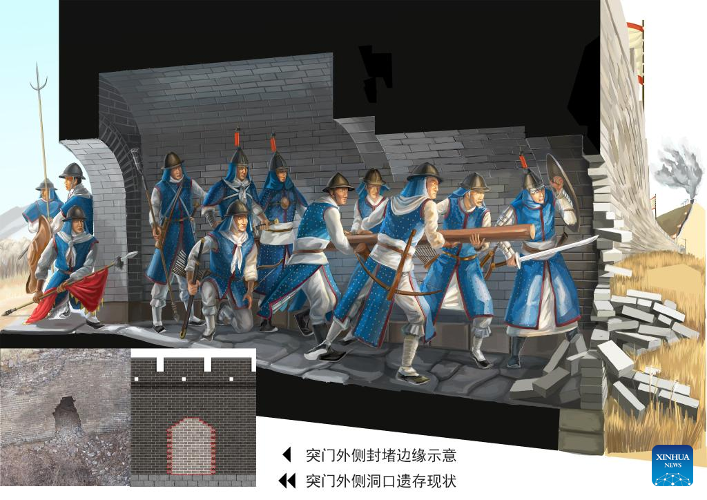 This drawing shows soldiers in defense breaking the gate from the inside of a hidden door of the Great Wall. (Tianjin University/Handout via Xinhua)