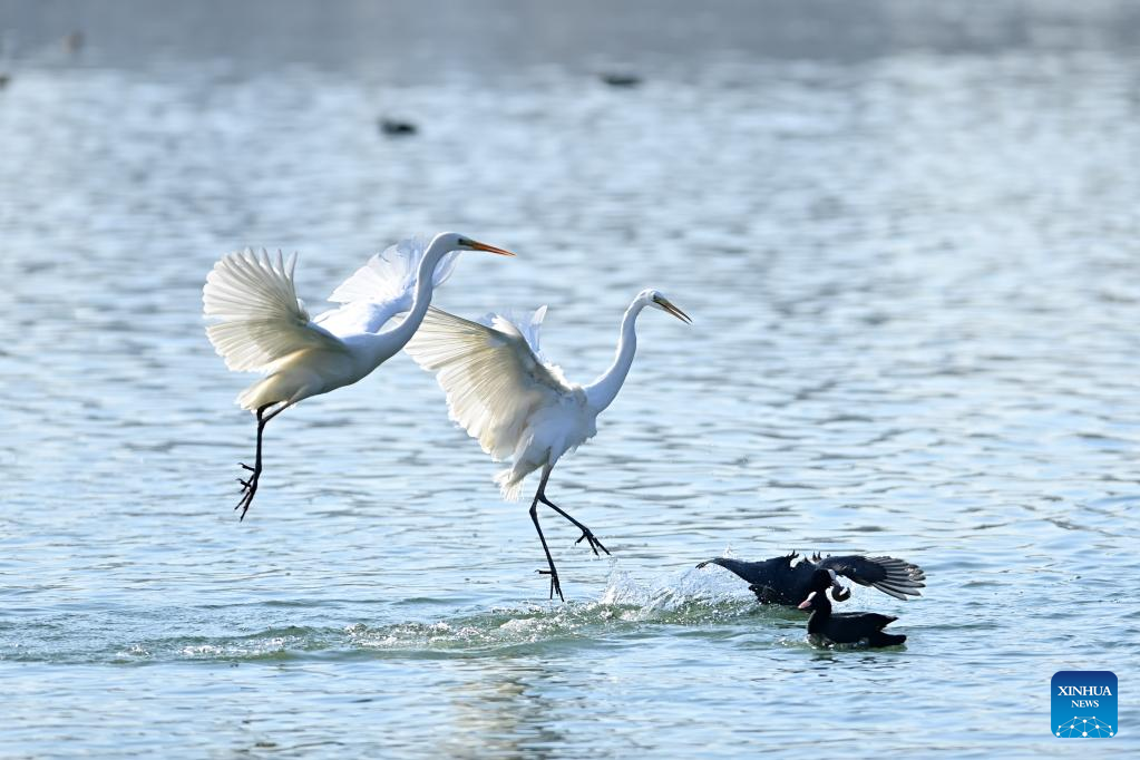 Egrets forage at Fenhe River in Taiyuan, capital city of north China's Shanxi Province, Jan. 4, 2023. (Xinhua/Yang Chenguang)