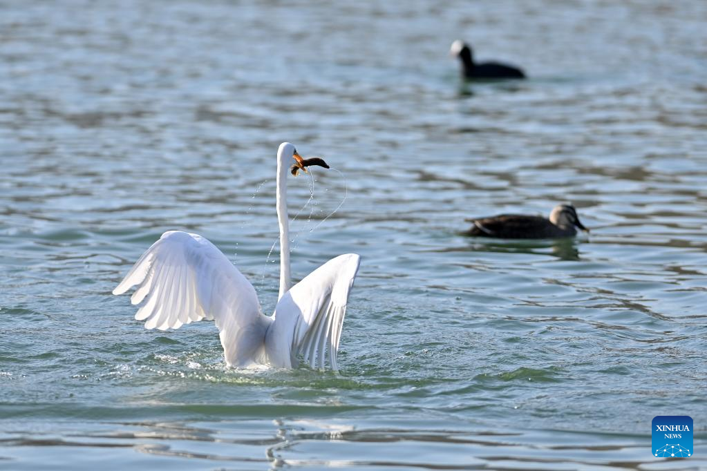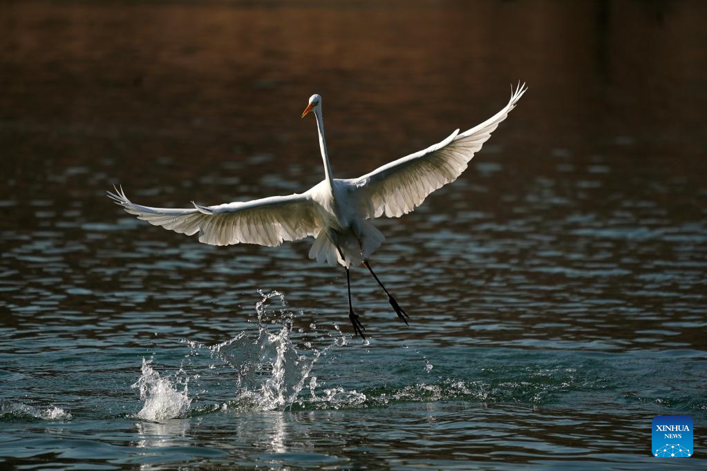 An egret forages at Fenhe River in Taiyuan, capital city of north China's Shanxi Province, Jan. 4, 2023. (Xinhua/Zhan Yan)