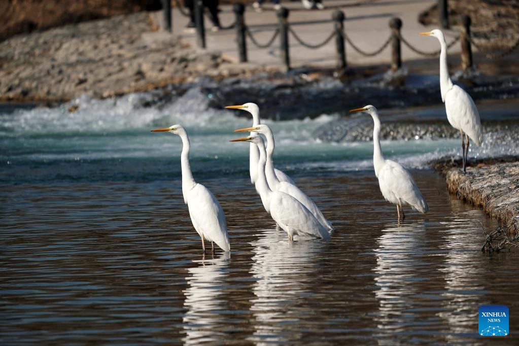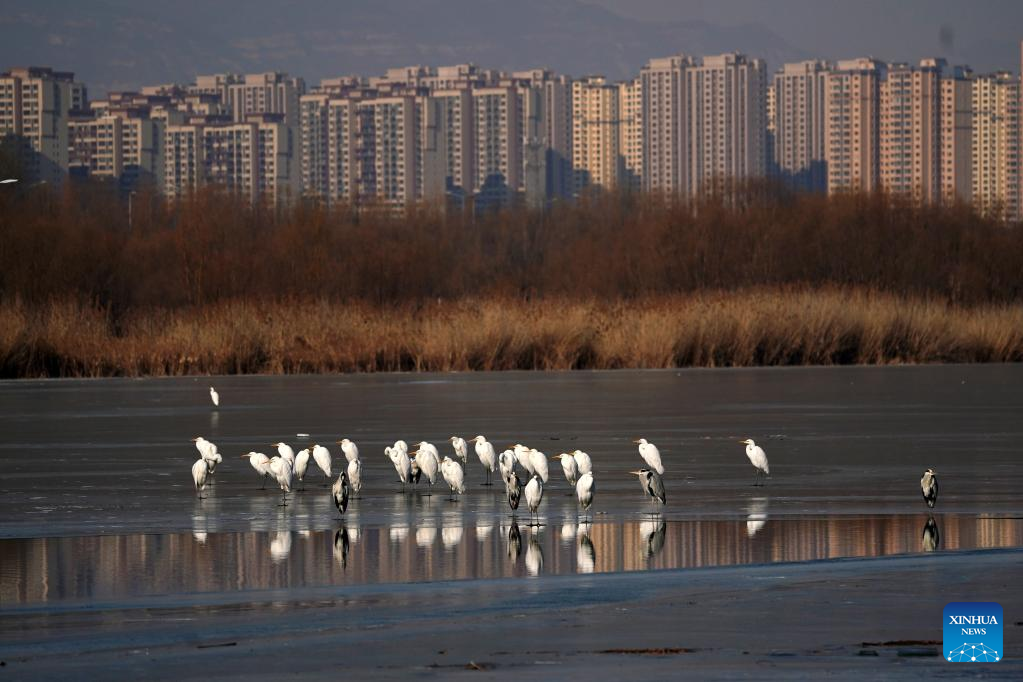 Egrets rest along Fenhe River in Taiyuan, capital city of north China's Shanxi Province, Jan. 4, 2023. (Xinhua/Zhan Yan)